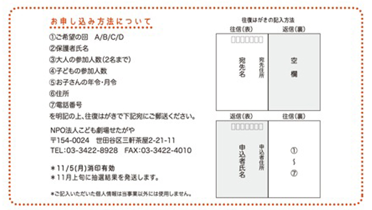 申込方法:往復はがき★11月5日消印有効★ 必ず事前にお申し込みください ★抽選の場合は、11月上旬に抽選結果を発送します