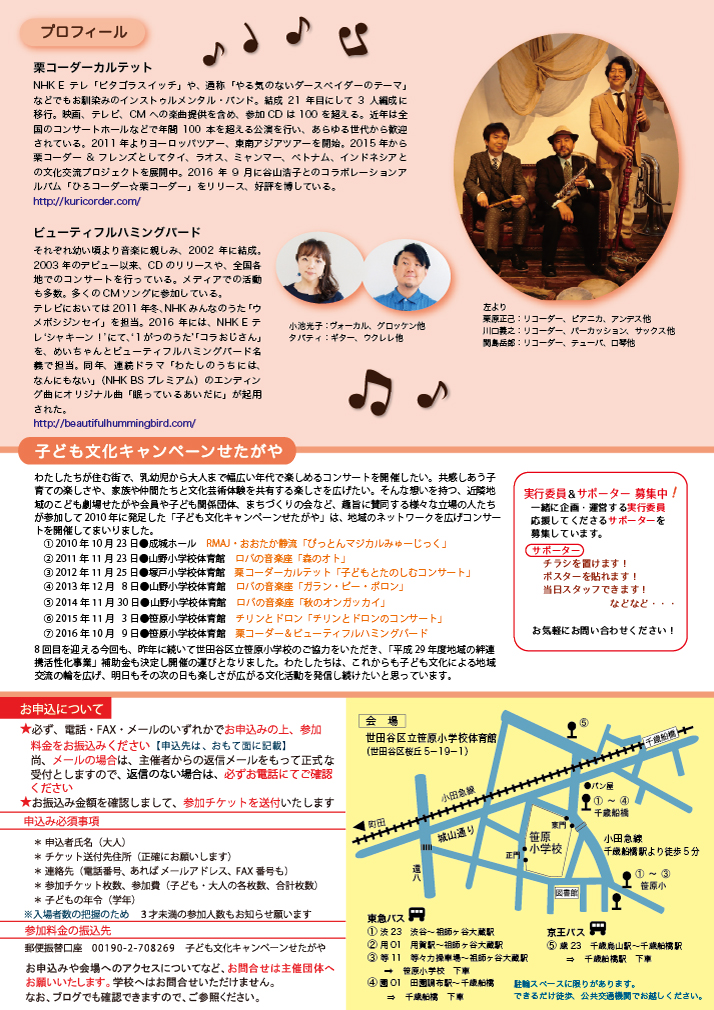 2017年11月5日(日) 会場 : 世田谷区立笹原小学校 14:00開演 (開場13:30)