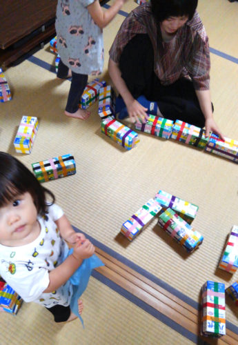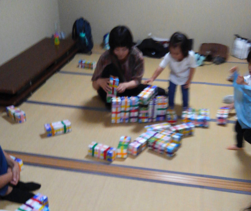 台風のあとの日射しが強いので、今日は室内で牛乳パックの積み木で遊びました。