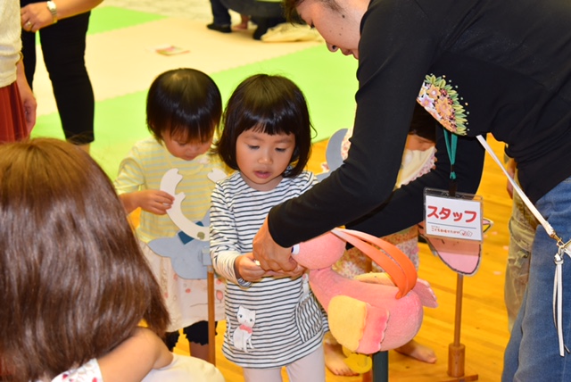 マットにお座りしてじーっと見入っている子もいれば、うれしくて舞台と客席の間を行ったり来たりする子も。