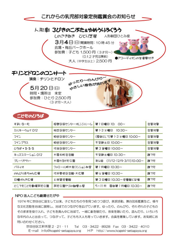 お申し込みやお問い合わせは、こども劇場せたがや事務局へご連絡ください。