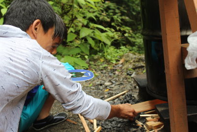 ボーイスカウトで培われた職人技で、薪の細い裂き方、新聞紙の丸め方、薪の配置の仕方(濡れているから下を太い薪でブロック)、うちわの仰ぎ方を教えてくれました。
