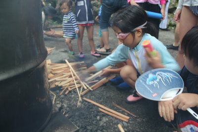 「コツは最後まで諦めないこと」!子どもたちは、必死にうちわであおいだり、薪をくべたりしていました。