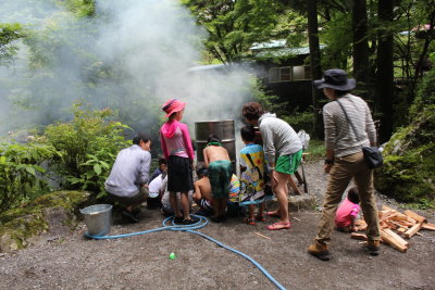 前日までの雨で、薪は湿った状態ですし、こんなに冷たい水が、果たしてお湯にかわるのかと不安になっていると・・・。