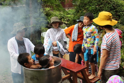 あんなに冷たかった水が、徐々に温かくなるころ、川遊びで体が冷えた子どもたちが、寒そうにしながらやってきました。五右衛門風呂に入れるのは今か今かと待っています。