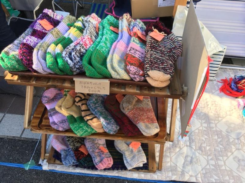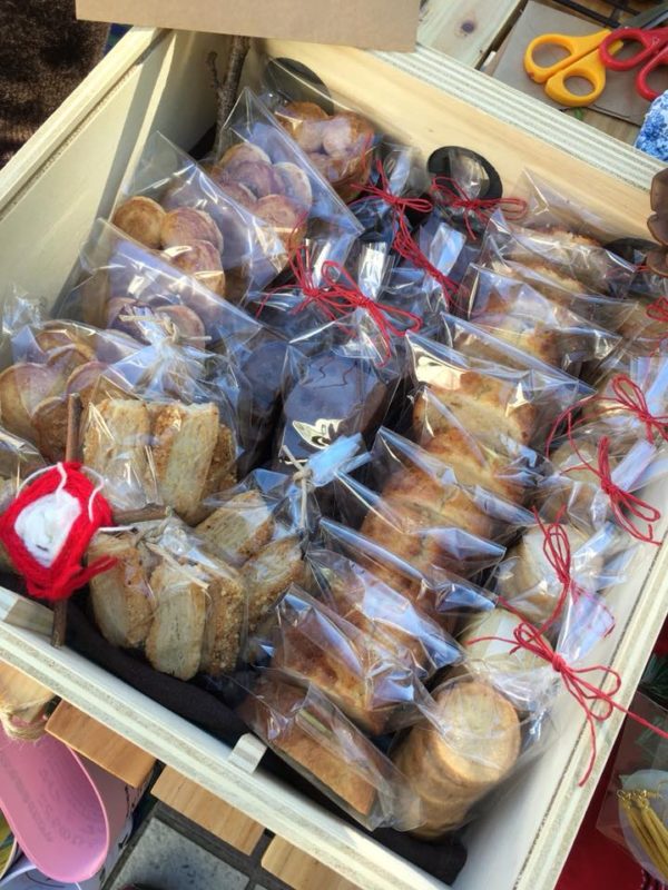 手作り品は、毛糸の靴下、サシェ、化粧ポーチ、ピアス、クッキー、ケーキなど、ど