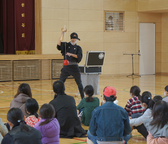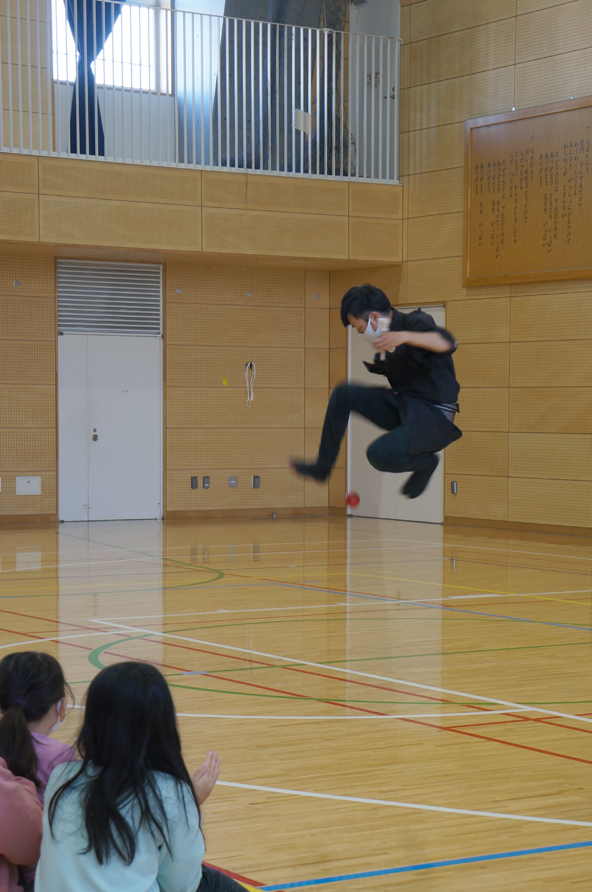「けん玉ショー」の始まりは、なんと体育館のテラス(5mほどの高さ)からの玉入れの技。入った瞬間には、一同「おおー!」の歓声。