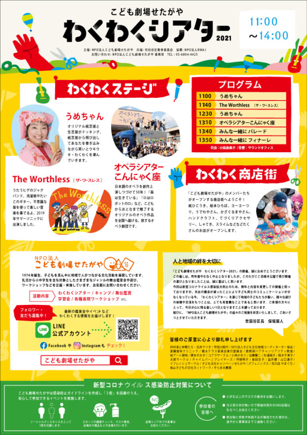 わくわくシアター2021は、開催当日4月25日に東京都に発出された緊急事態宣言により、直前の4月23日に開催延期をお知らせし(下記【延期します】)、秋には感染拡大状況も治まり開催できるだろうと、2018年まで開催してきた「馬事公苑前けやき広場」で9月26日(日)に開催できるよう準備を進めて参りました。
