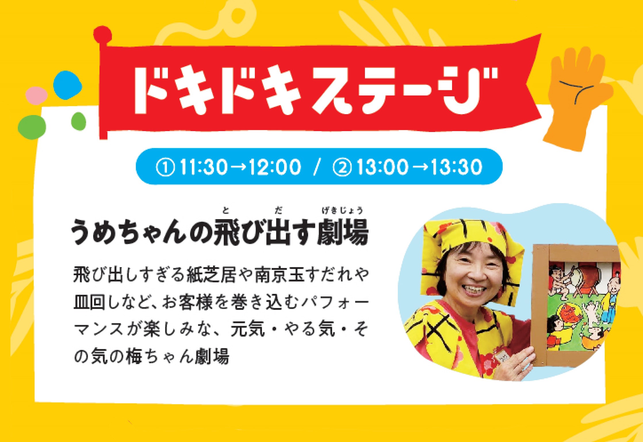 トレードマークの衣装を着たうめちゃんの『飛び出す劇場』は、今やわくわくシアターの定番になりました。 クイズあり、チャンバラあり、大道芸ありのバラエティー豊かな 30分。子どもたちはもちろん、大人も思わす足を止めて惹き付けられる、密度の高い紙芝居です!欅の木陰であの世界を満喫した人たちにとっ ては、もはや忘れられない世田谷の「原風景」になるのかもしれません。