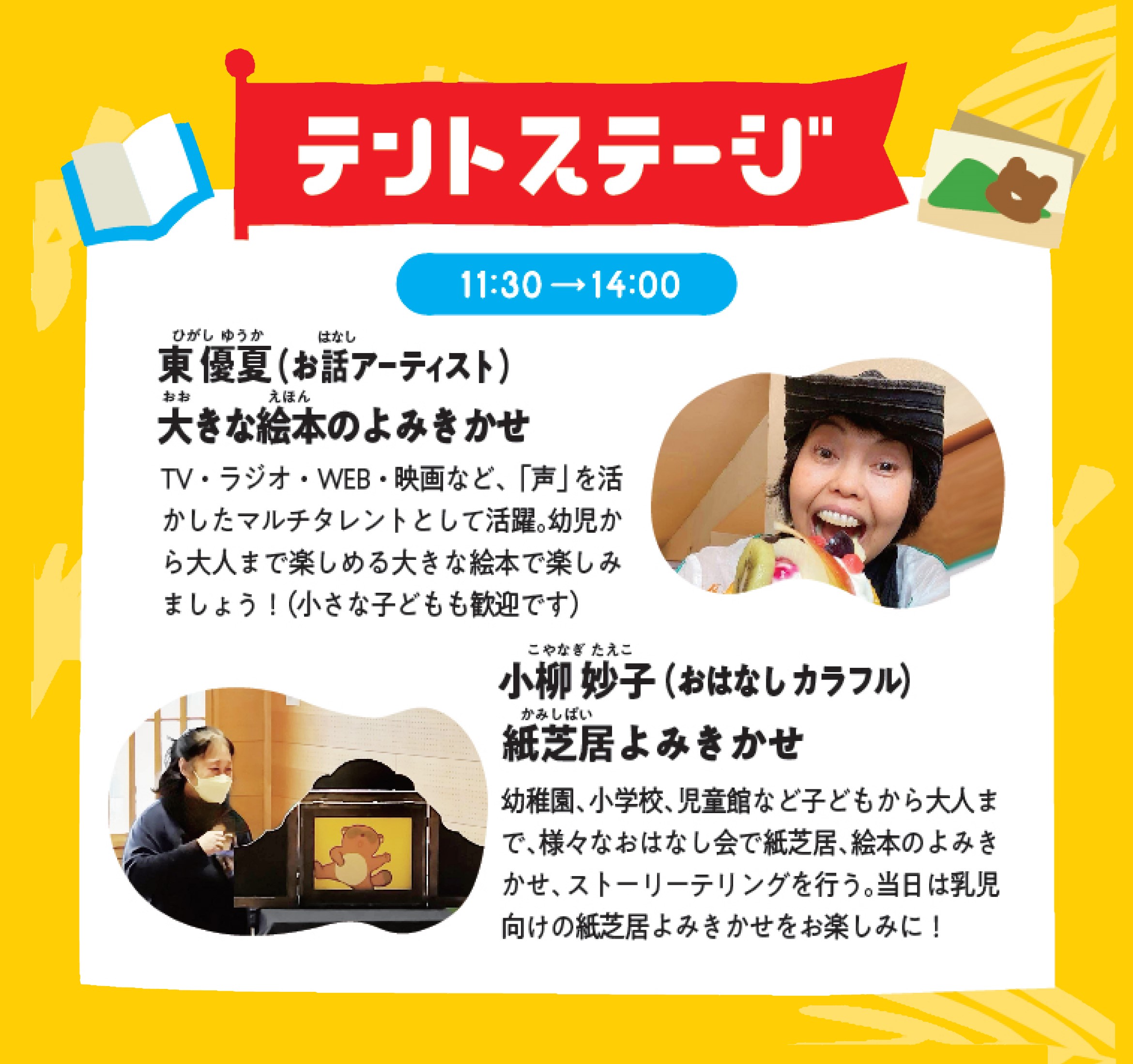 大きな絵本テントでは、お話ア ーティスト束さんが、おはなしの途中にニワトリや犬の嗚き声を出して、みんなも大きな声で巻加したりして楽しみました。