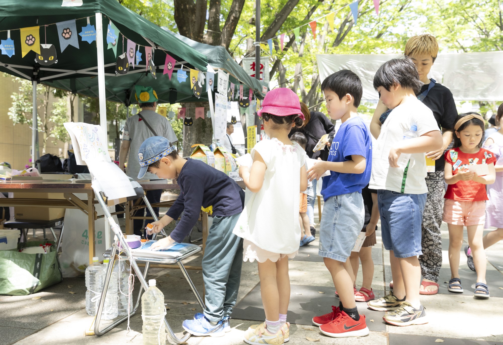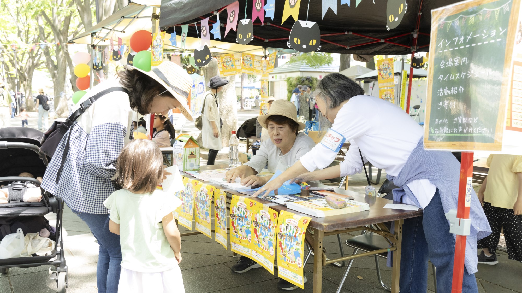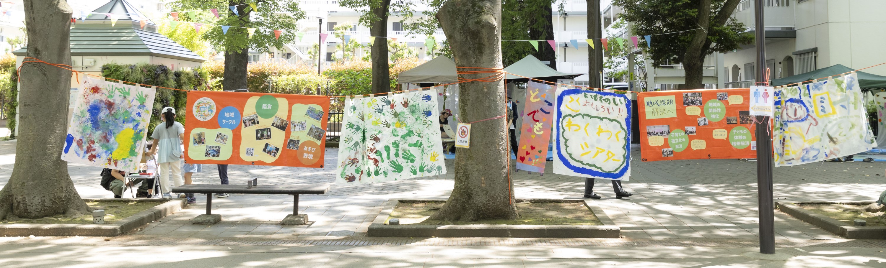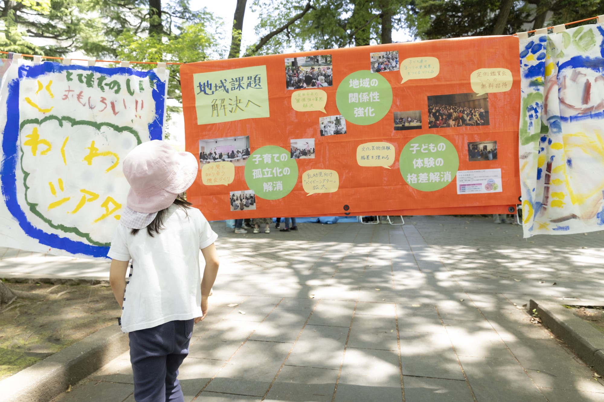 活動紹介やサークル紹介、50周年企画、取り組む地域課題をわかりやすく表現し、子どもたち手づくりのフラッグと一緒に装飾しました。立ち止まって見てくれる人もたくさん!