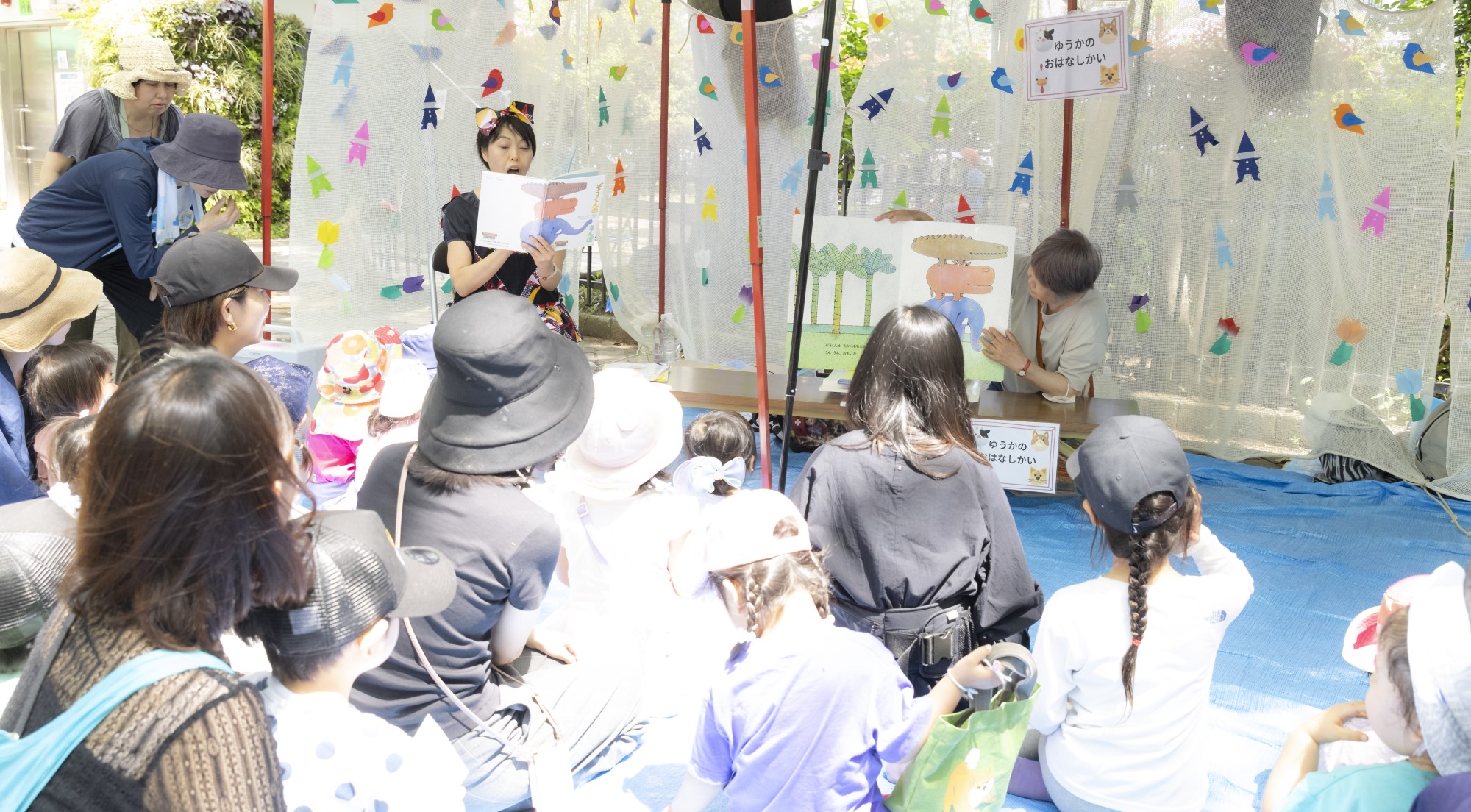 大きな絵本テントでは、お話ア ーティスト束さんが、おはなしの途中にニワトリや犬の嗚き声を出して、みんなも大きな声で巻加したりして楽しみました。