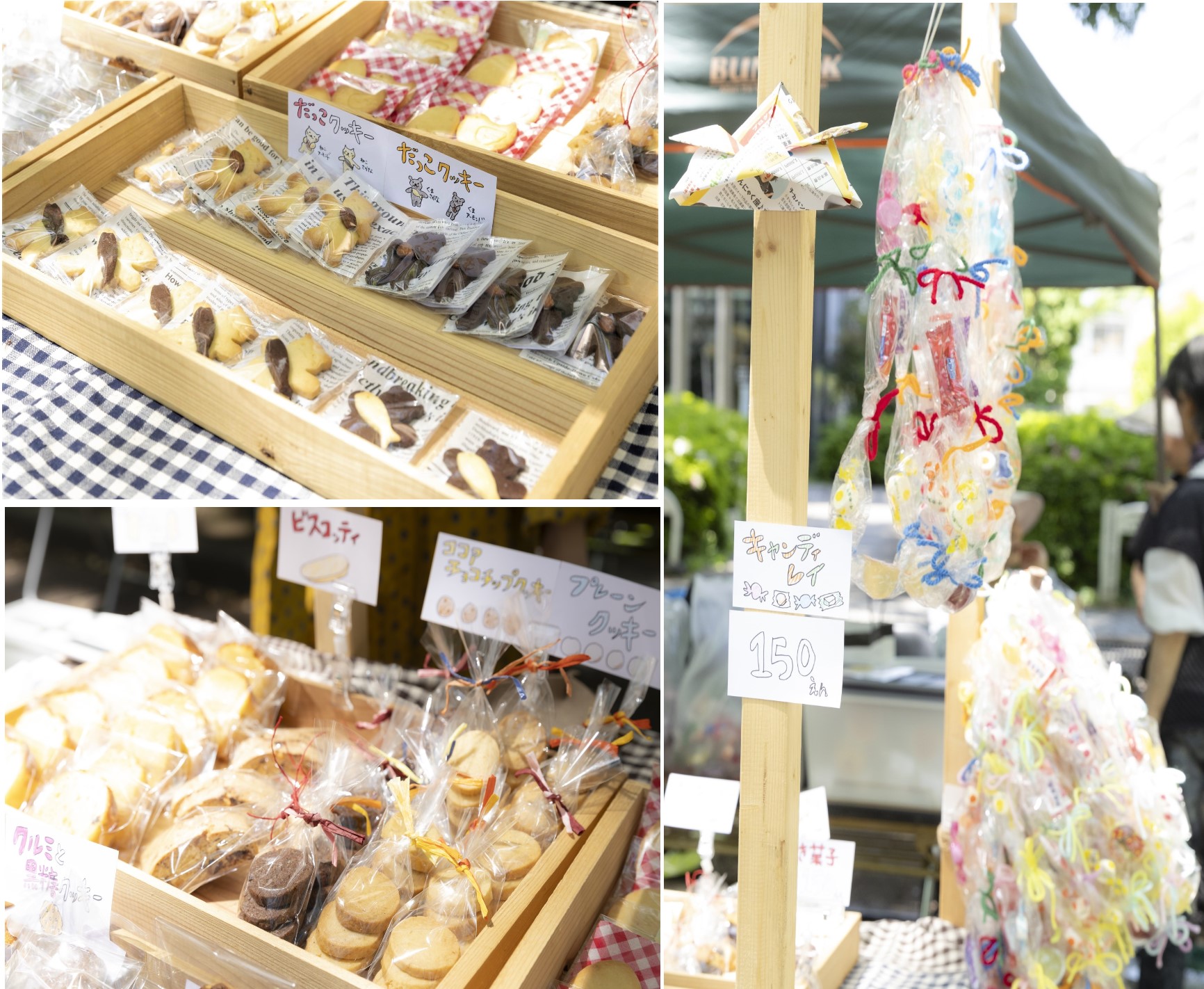 ネコ足跡の焼印マドレー ヌ、パウンドケ ーキ、ネコ型やサカ ナ型のクッキーなど12種類・約270袋。それにキャンディレイも100本以上作り、どちらも即完売!