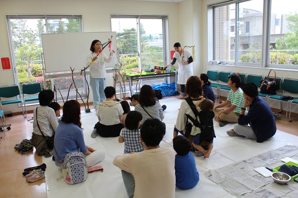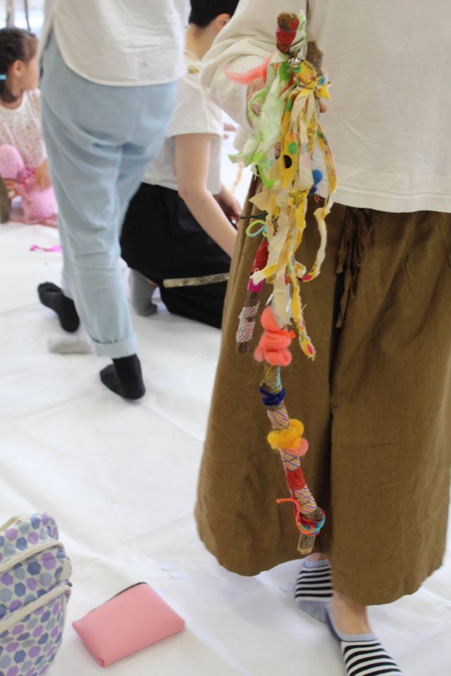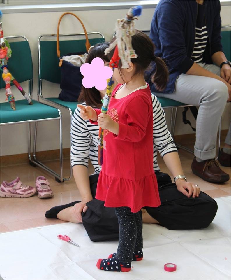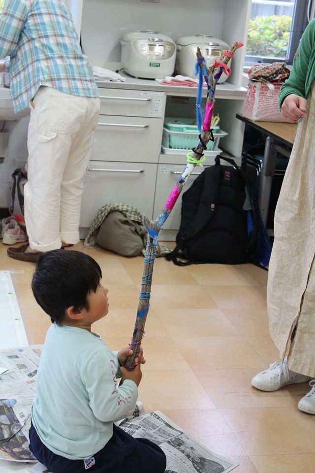 なるべくお子さんにやらせてあげようと、見守る大人たち。ご協力ありがとうございました。最後は鈴をつけて完成です!!