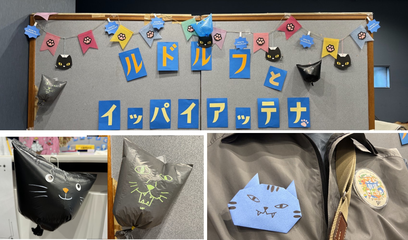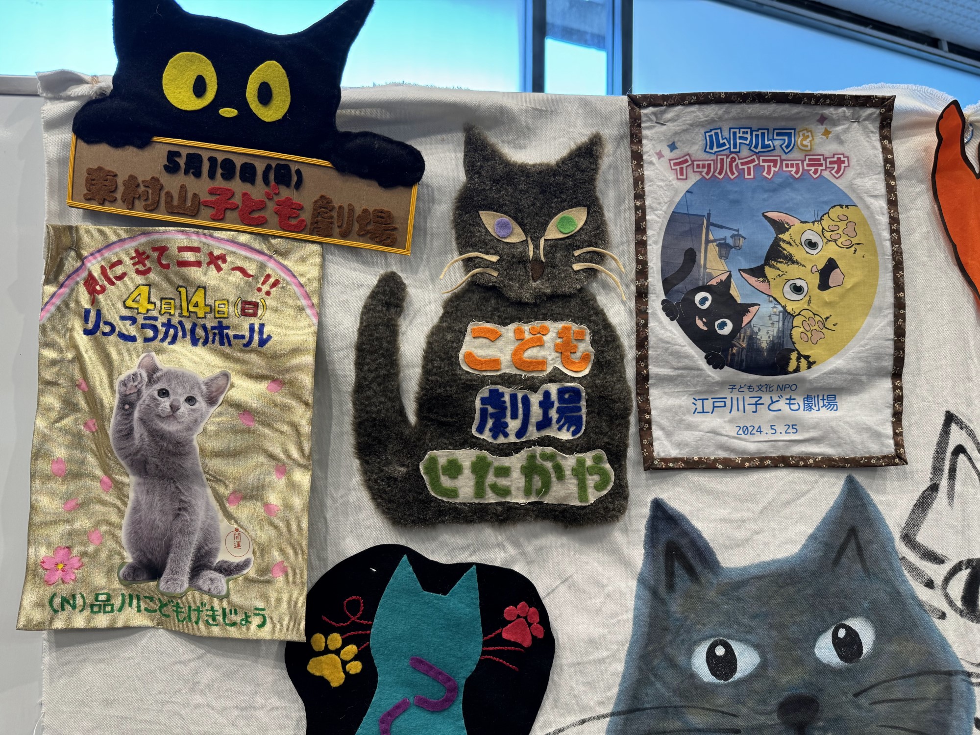ロビーには、首都圏ツアーで上演する各こども劇場がつくった旗や、ビニール風船猫・ルドルフガーランドの装飾、猫耳撮影スポットもあって、開演前のわくわくを盛り上げました。