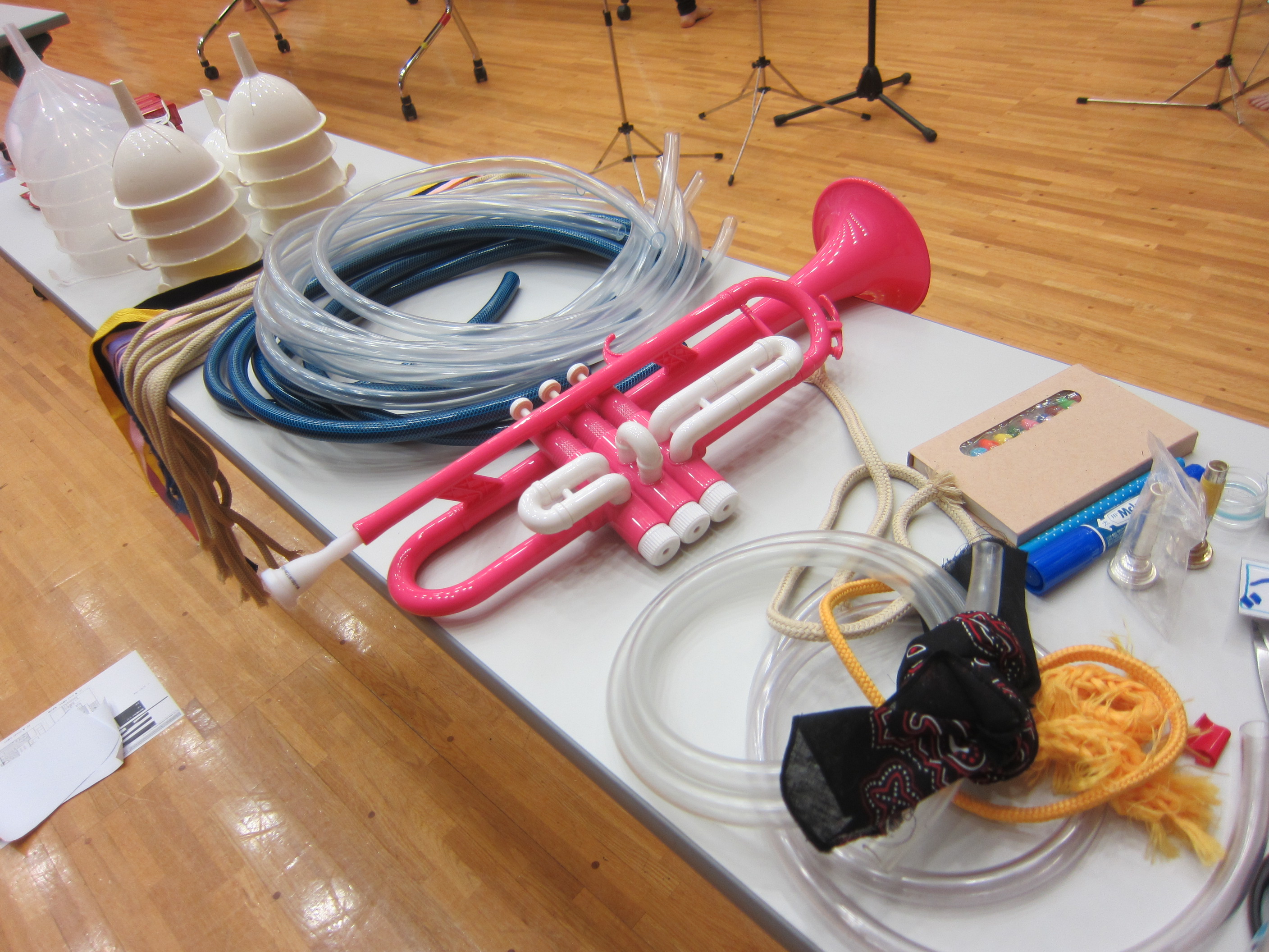 ロート(大小2種類ありました)、ビニールホース 、マウス(吹き口に付けるもの)、ロープ、リボン。「この材料で作るんだー!」と、子どもたちは驚きの様子で、好みの材料をそれぞれ選びました。