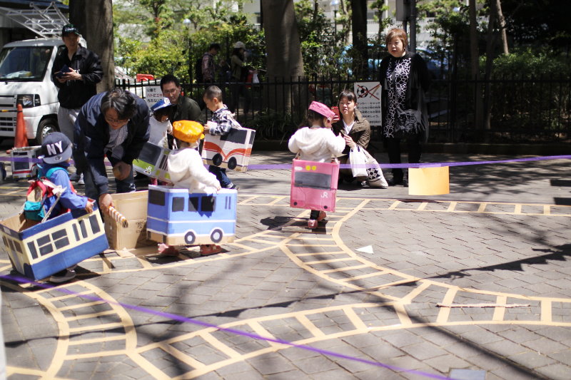 「わくわくタウン」はカラフルな電車や車を選んで、線路?を歩いて回れます。今年は、係りの車掌さんのカラフル帽子がいつの間にか大人気に。パパの踏み切り係りは、子どもたちとハイタッチ!