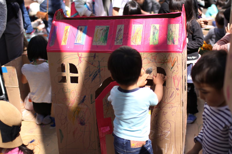 段ボールをその場で切り抜いたり、組み立てたりして、おうちを作りました。いっぱい落書きできて楽しかったね!
